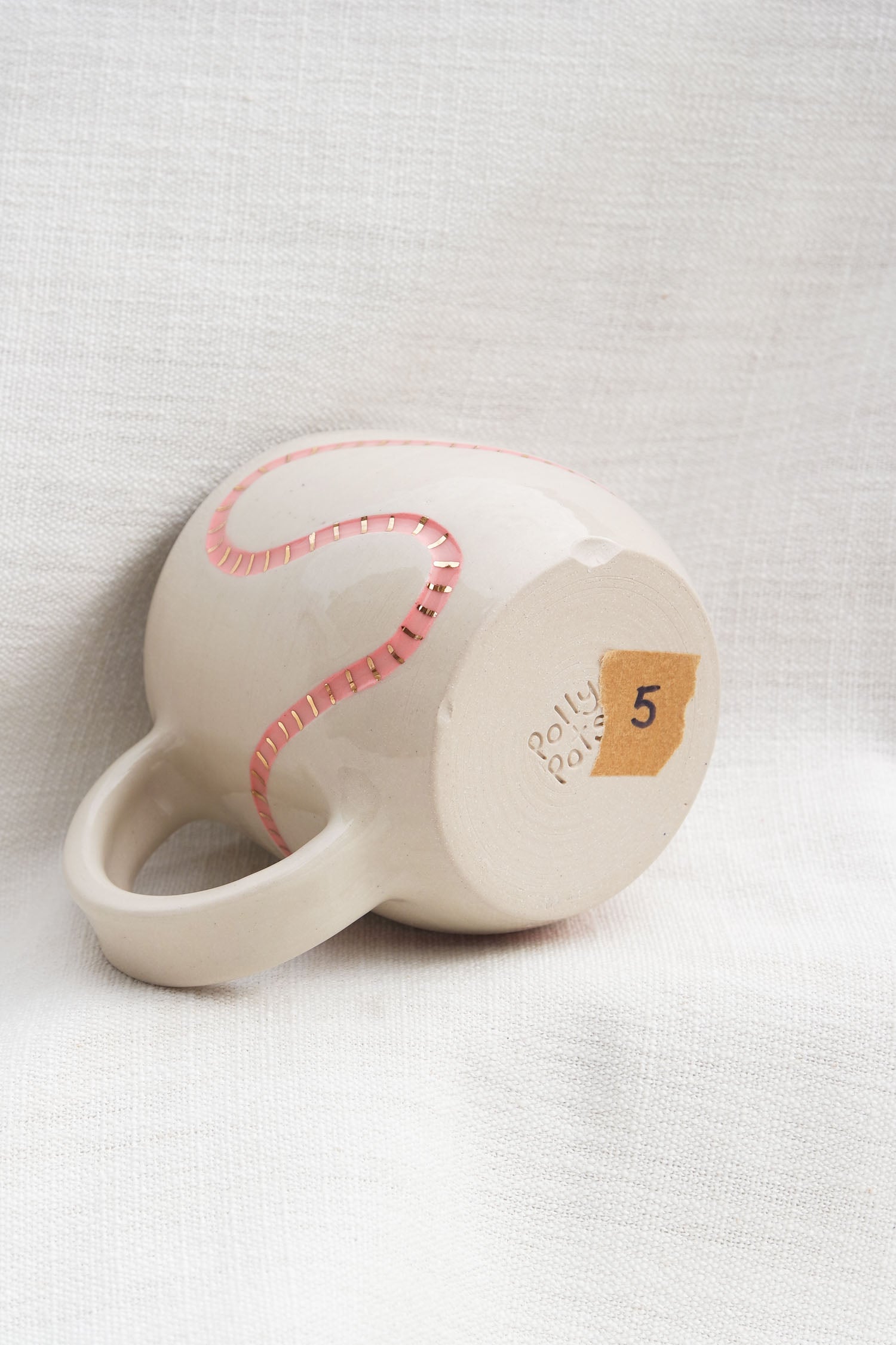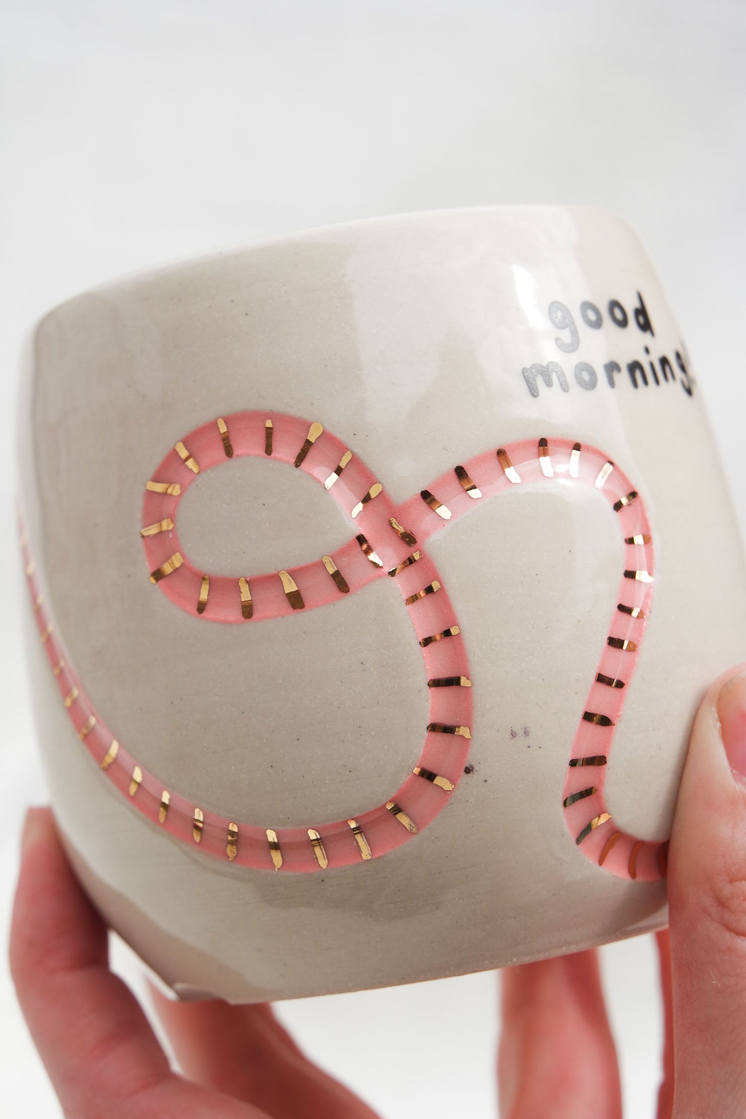 The exterior of the mug is hand carved and painted pink for the worm, and covered in a clear gloss. The smiley face and gold stripes are hand painted, and the writing is a fired on permanent ceramic decal.