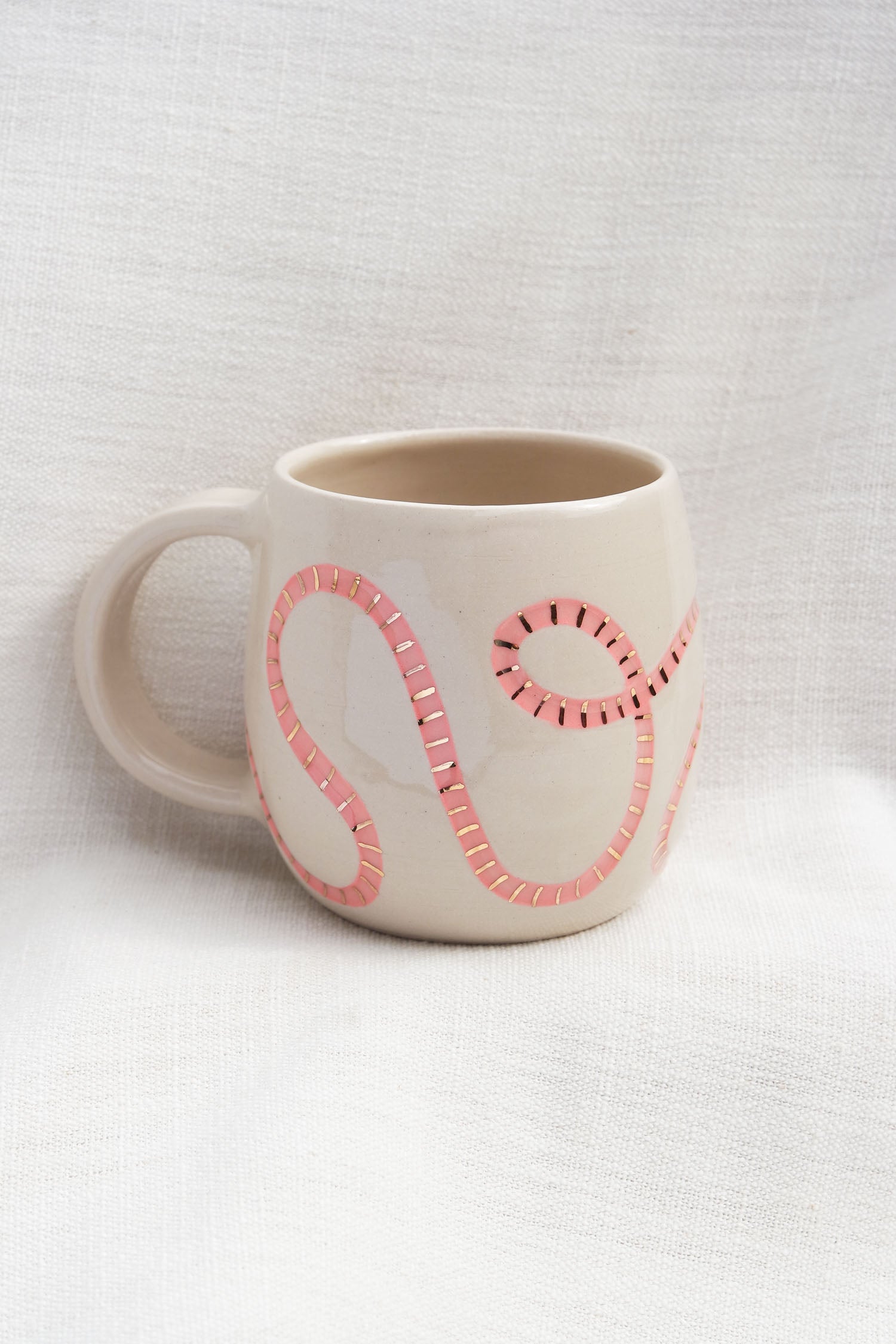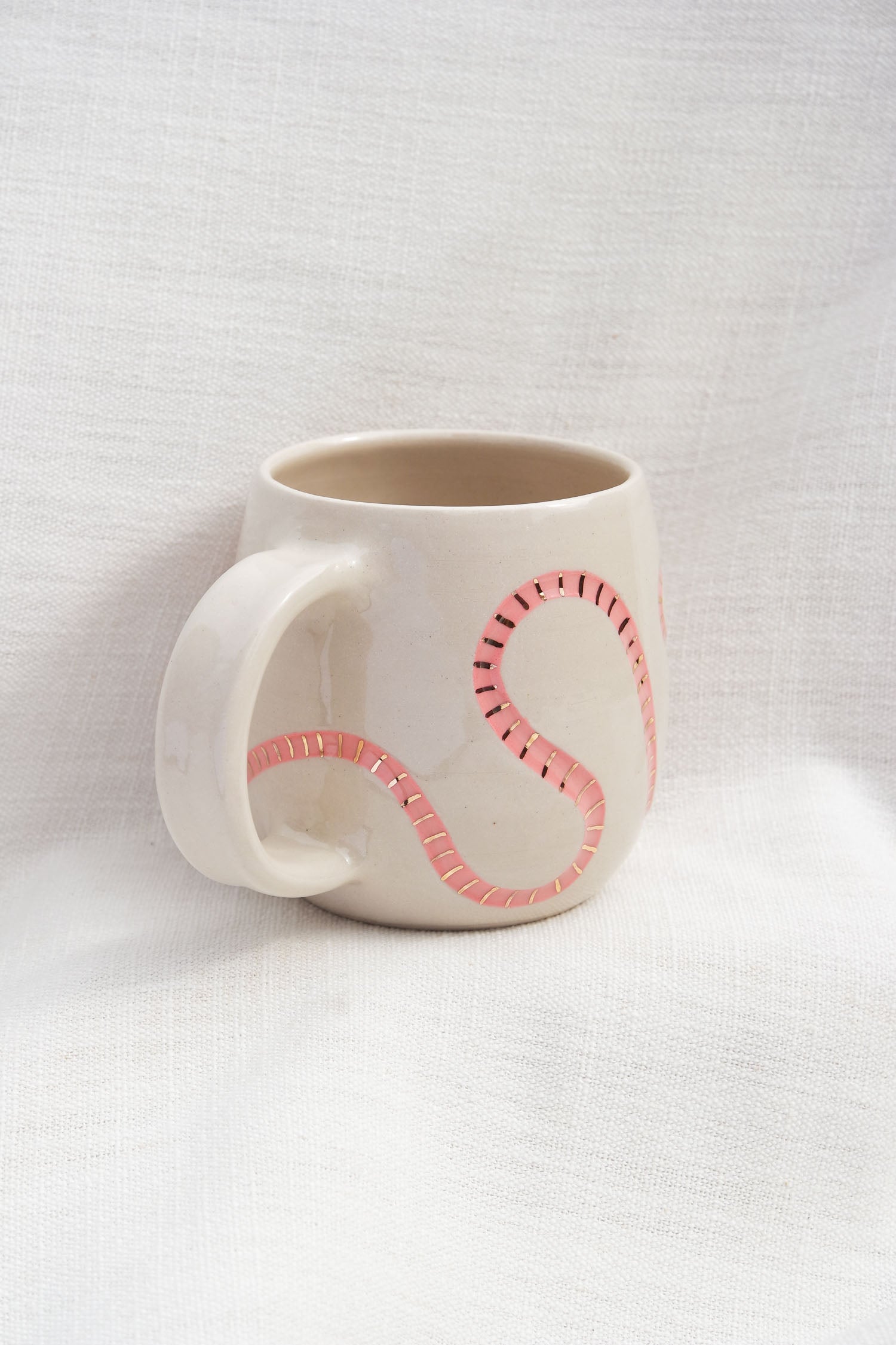 The exterior of the mug is hand carved and painted pink for the worm, and covered in a clear gloss. The smiley face and gold stripes are hand painted, and the writing is a fired on permanent ceramic decal.