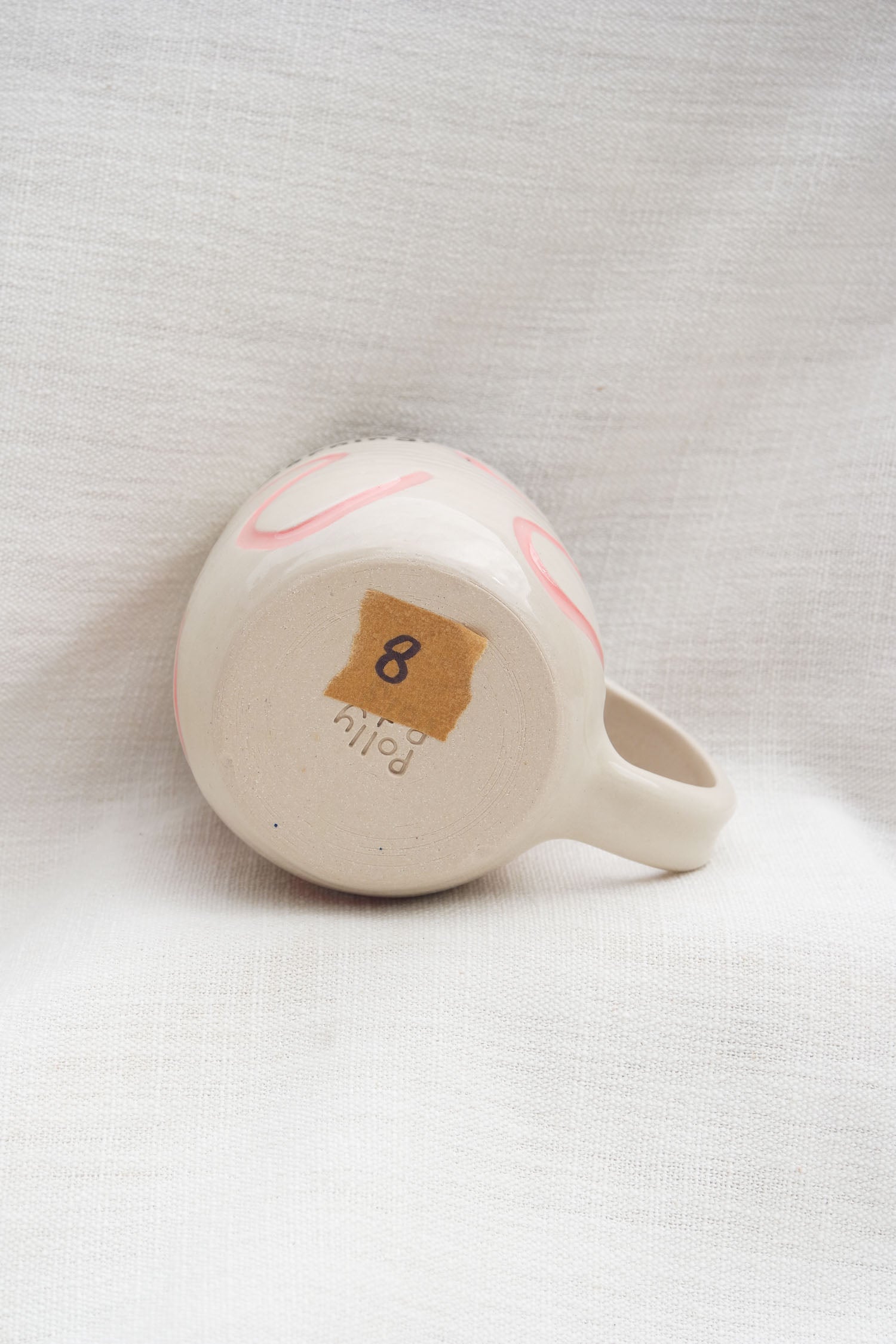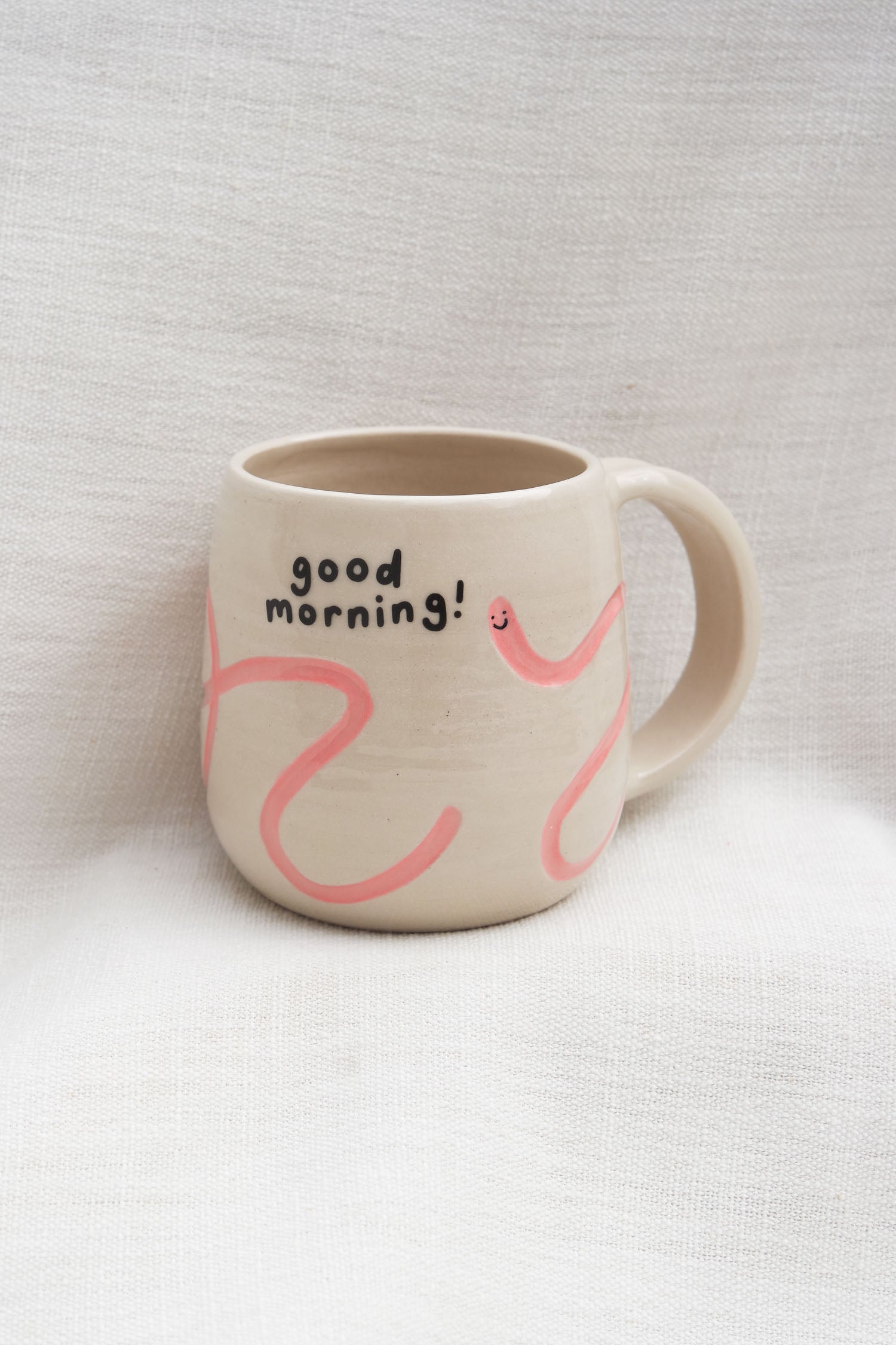 The exterior of the mug is hand carved and painted pink for the worm, and covered in a clear gloss. The smiley face and gold stripes are hand painted, and the writing is a fired on permanent ceramic decal.